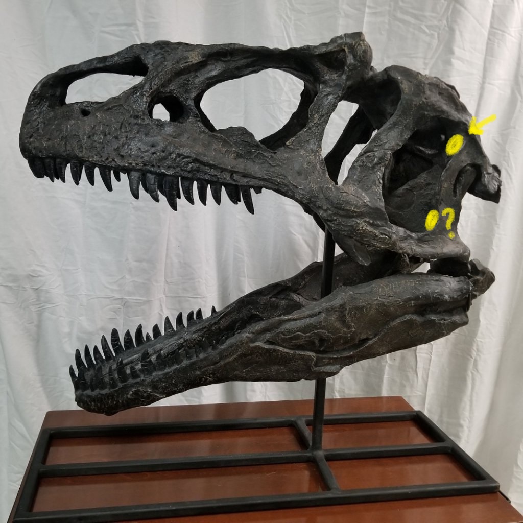 Posible ubicación del meato auditivo externo en un Allosaurus. Y una posibilidad extra (la de abajo).